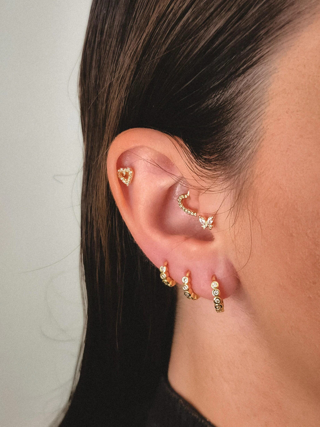 A argolinha cravejada com zircônias tamanho G, é indicada para usar no 1° furo.