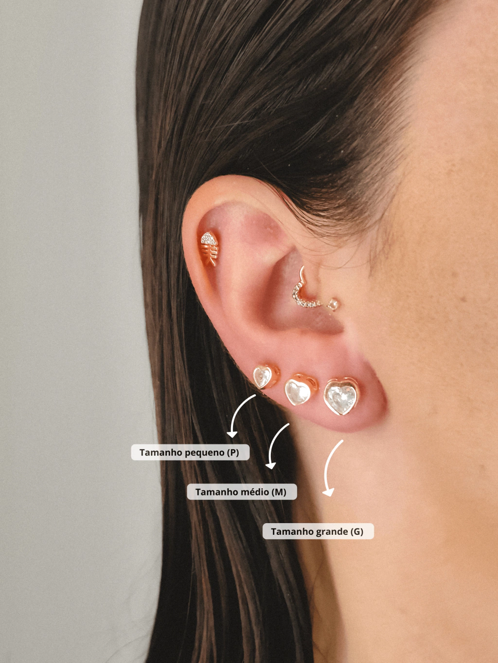 O brinco ponto de luz tamanho M, é indicada para usar no 1° ou 2° furo.